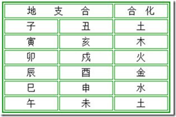 十二地支阴阳两两相合,是为六合:子丑合土,寅亥合木,卯戌合火,辰酉合金,巳申合水,午未合土。
